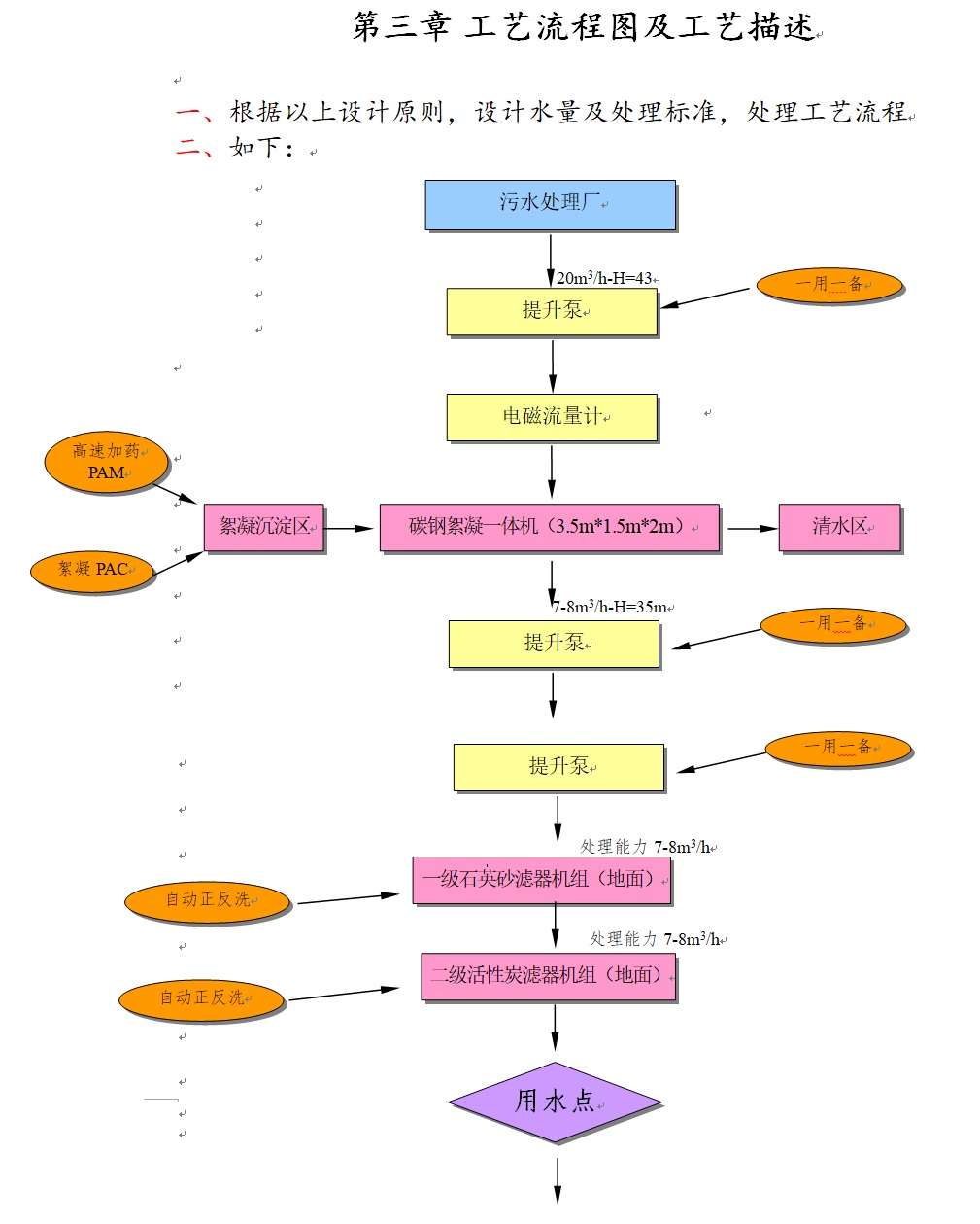 一、根據(jù)以上設(shè)計原則,設(shè)計水量及處理標(biāo)準(zhǔn),處理工藝流程